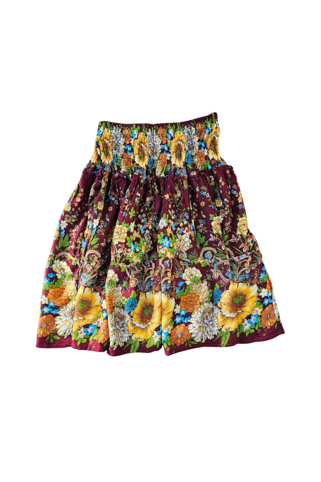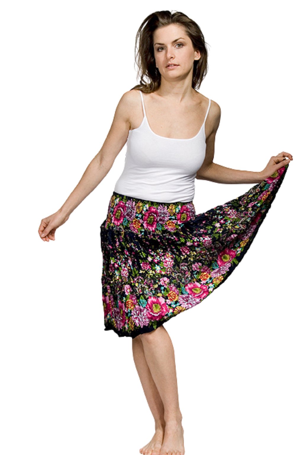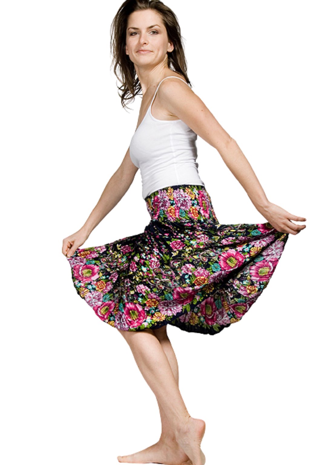 Velmi příjemná sukně s krásnými originálními květinovými motivy. Je vyrobena z kvalitního viskózového hedvábí. Elastický „žebrovaný“ pas se krásně přizpůsobí křivkám vašeho těla. Je příjemná na tělo, vzdušná, lehká, v létě chladí a nepotíte se v ní. Sukně působí vesele, ale zároveň i velmi elegantně. Hodí se jak do práce, tak i na procházku či s kamarádkami do města. Sukně, ve které stoprocentně zaujmete.
