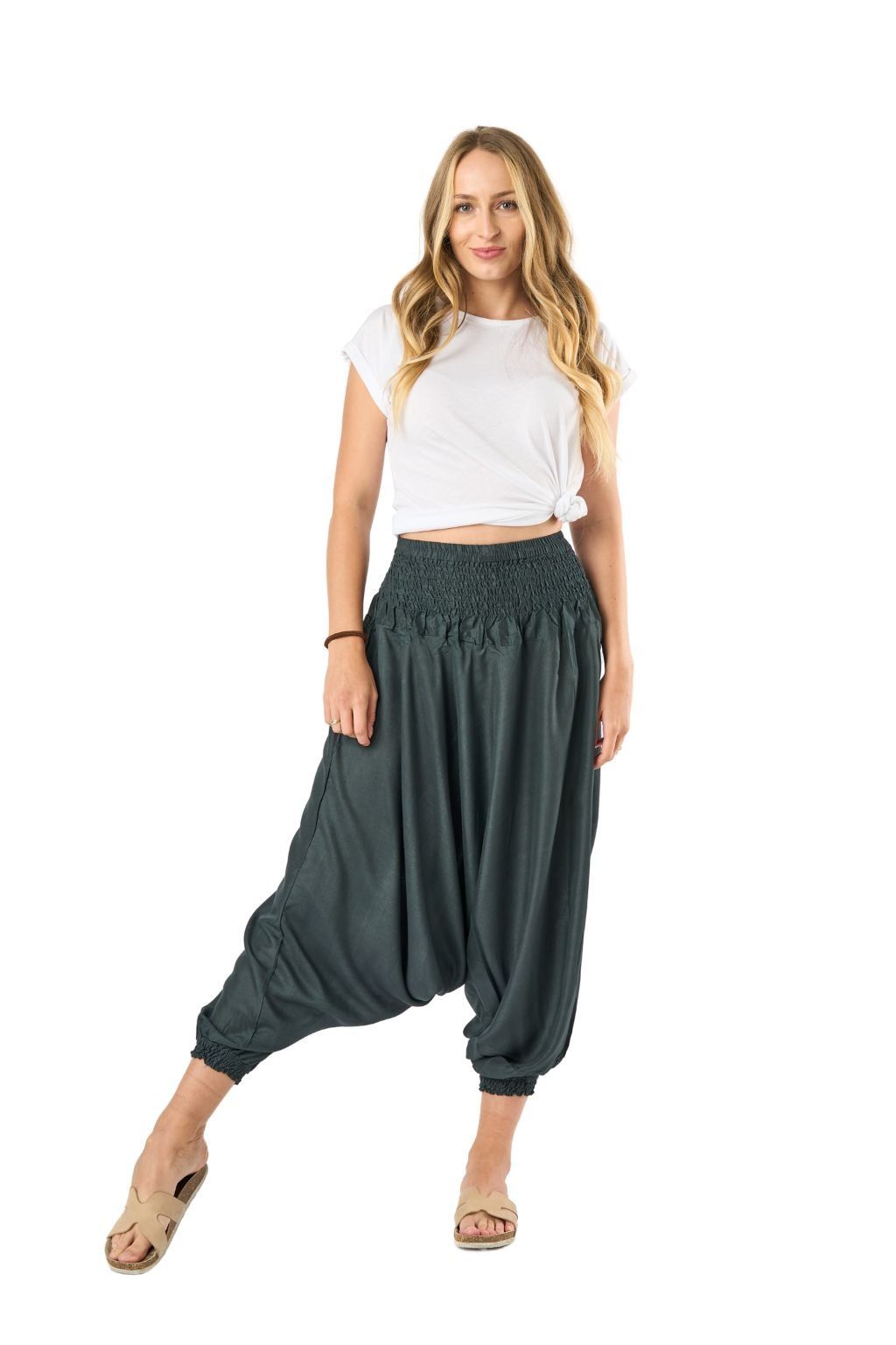 Když chceš pohodlí a trochu boho elegance. Volné nohavice, hluboký sed, nahoře tričko nebo tílko – a jsi ready na město, na návštěvu i do kavárny. - 2) Tříčtvrťáky