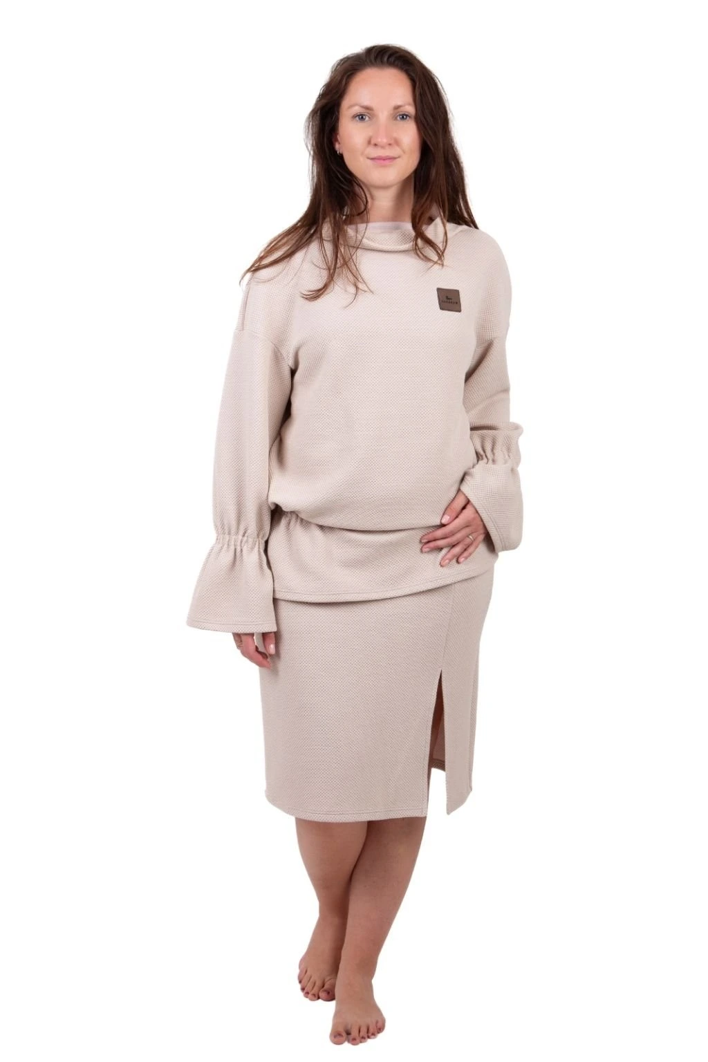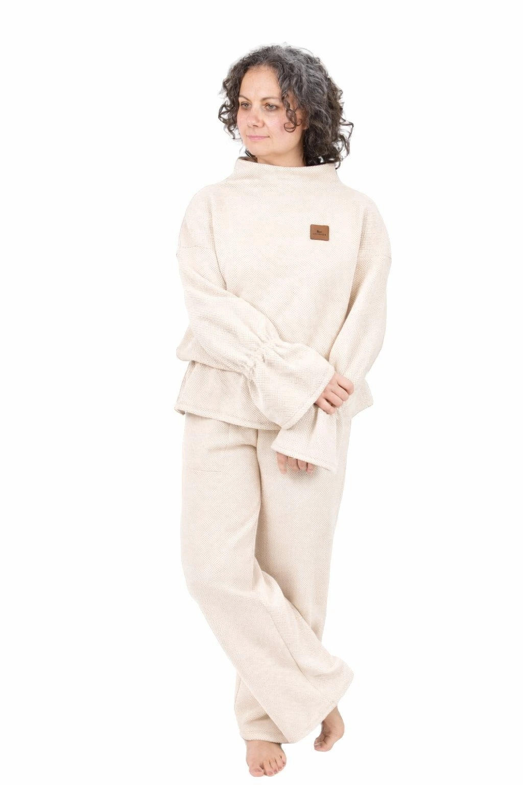 Kalhoty můžete snadno doplnit o krásnou elegantní mikinu s volány, která je ušita ze stejného materiálu. Vytvoříte tak elegantní, dokonale sladěnou soupravu.