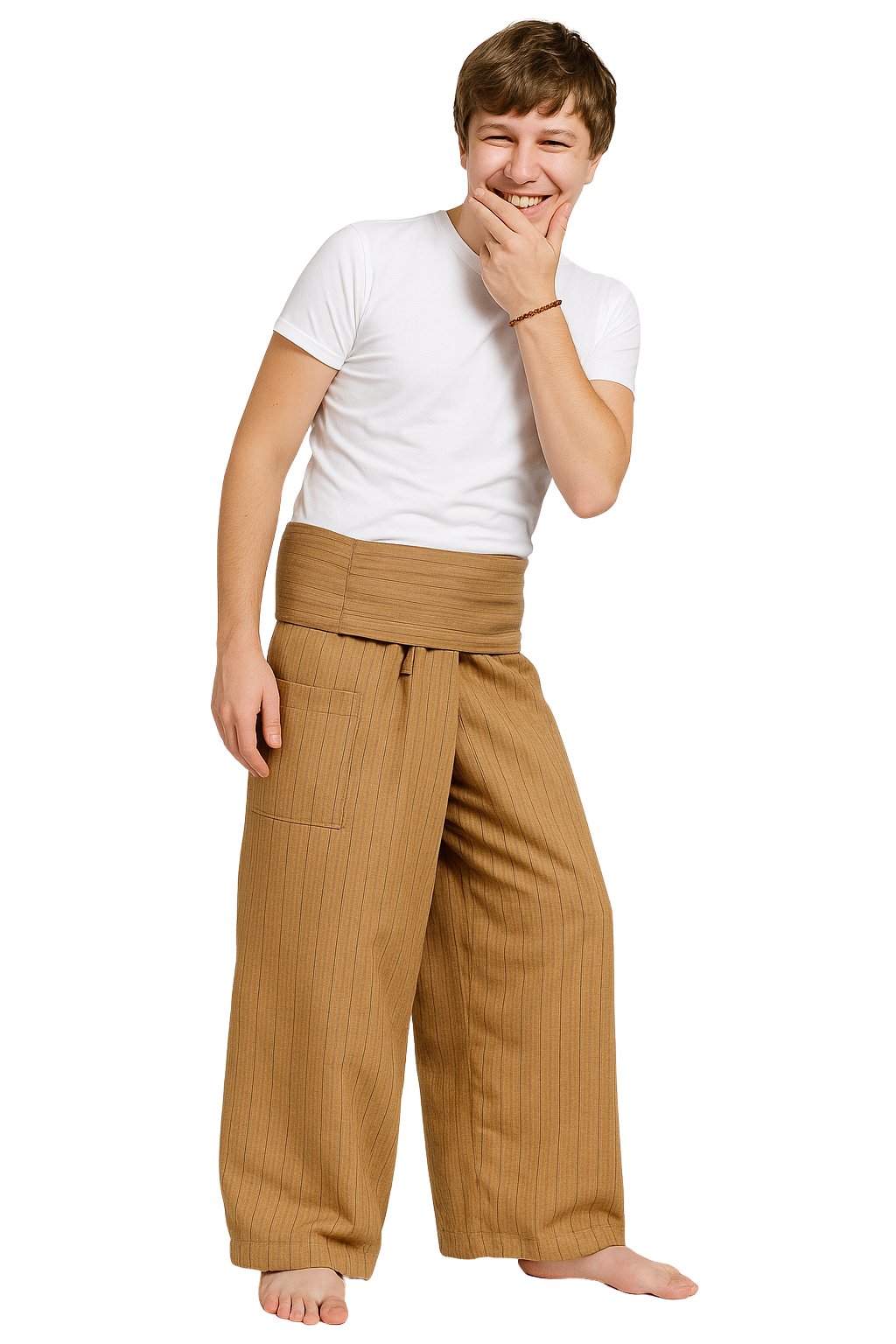Zavinovací kalhoty FISHERMAN PANTS neboli „rybářské kalhoty“ jsou celosvětově velice oblíbené pro pohodlí, které nabízejí, a univerzální velikost. Typickým znakem fishermanek je velikost „one size fits for all“ . Prostě – padnou každému. Jsou extra široké, zavinutím je přizpůsobíte šířce pasu a ohnutím v pase můžete nastavit libovolnou délku. Nikde vás neobepínají, neškrtí, jsou velice pohodlné, vzdušné a flexibilně se přizpůsobí vašemu pohybu. Jsou vyrobeny z velmi kvalitní bavlny. Fishermanky jsou vhodné pro muže i ženy, lze u nich libovolně nastavit délku nohavic i jejich velikost v pase. Dá se říci, že jsou to zavinovací kalhoty, hodí se na nošení ve volném čase, na bojová, relaxační či meditační cvičení, na jógu, tai chi, ale i na turistiku a jiné outdoorové aktivity. Díky své univerzální velikosti a nastavitelnosti jsou fishermanky velmi oblíbené i u těhotných žen.